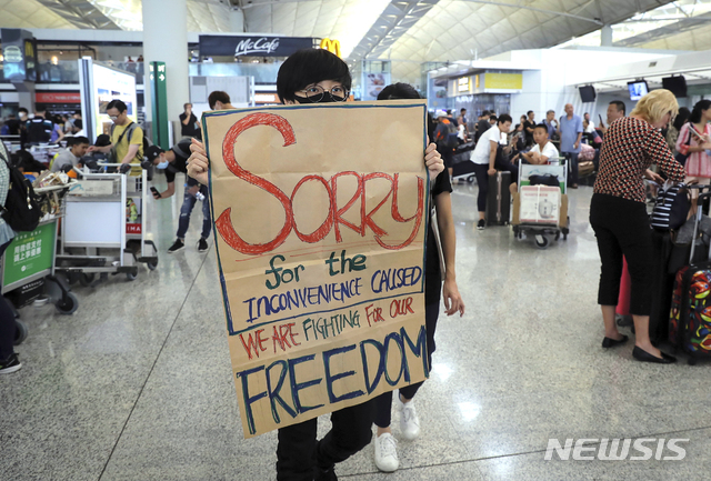 【홍콩=AP/뉴시스】13일(이하 현지시간) 홍콩 국제공항에서 한 시위대가 불편을 겪고 있는 여행자들에게 "불편을 줘서 미안하다, 자유를 위해 투쟁 중이다"라는 팻말을 들고 걷고 있다.