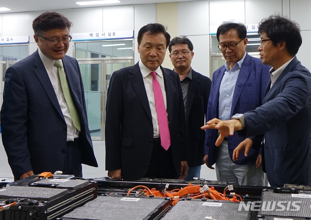 【제주=뉴시스】배상철 기자 = 손학규 바른미래당 대표가 16일 오전 제주 전기차배터리산업화 센터에서 전기자동차의 폐배터리를 둘러보고 있다. 2019.08.16.