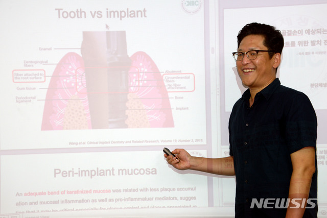분당제생병원 치과 조성용 보철과장이 임플란트와 보철치료를 위해 발치 후 심한 골 결손이 예상되는 부위 좋은 예후를 위해서 반드시 해야 하는 전략적인 발치 후 처치와 그 중요성에 대해 강의하고 있다. 2019.08.21