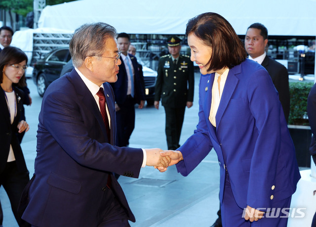 【방콕(태국)=뉴시스】박진희 기자 = 태국을 공식 방문 중인 문재인 대통령이 2일 오후 태국 방콕 센트럴월드 쇼핑몰에서 열린 'Brand K 론칭쇼'에 도착해 박영선 중소벤처기업부 장관과 인사하고 있다.2019.09.02.