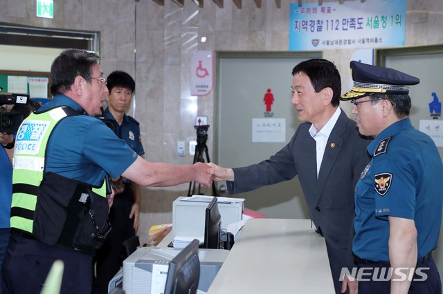 【서울=뉴시스】진영 행정안전부 장관이 11일 추석 맞이 교통 및 치안상황 등을 점검하기 위해 서울역파출소 경찰근무자들을 격려하고 있다. 2019.09.11. (사진=행정안전부 제공)