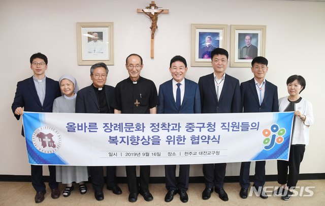 협약에 따라 중구청 직원은 본인과 부모·형제자매·자녀·배우자 사망시 중구 대흥동에 있는 가톨릭대학교 성모병원 장례식장을 이용할 경우 빈소 사용료를 일부 감면받게 된다. 2019.09.16. (사진= 중구청 제공)