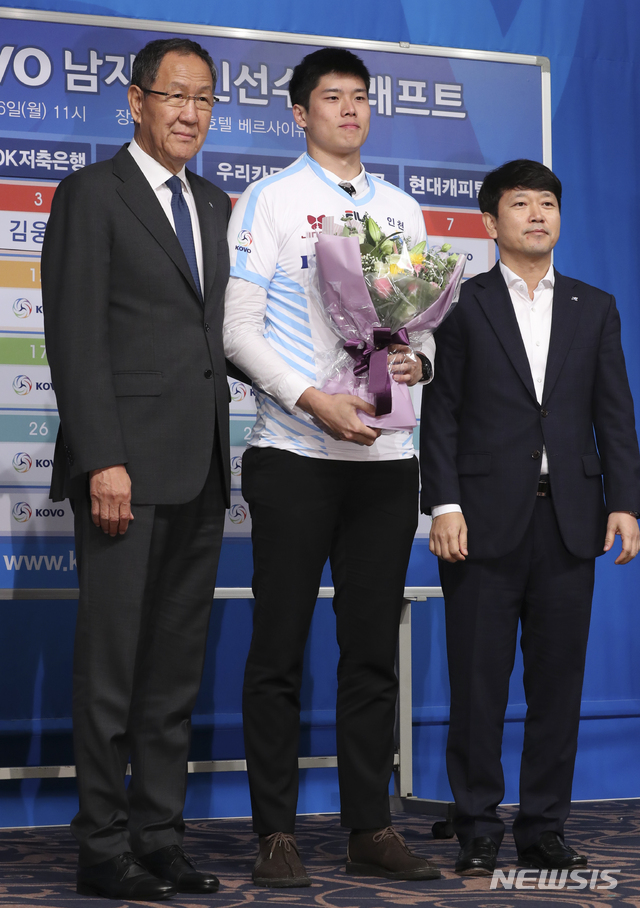 【서울=뉴시스】최진석 기자 = 홍콩 출신 경희대 알렉스가 16일 서울 강남구 청담동 리베라호텔에서 열린 2019~2020 KOVO 남자 신인선수 드래프트에서 1라운드 6순위로 대한항공에 지명된 뒤 대한항공 박기원 감독과 함께 포즈를 취하고 있다. 2019.09.16.