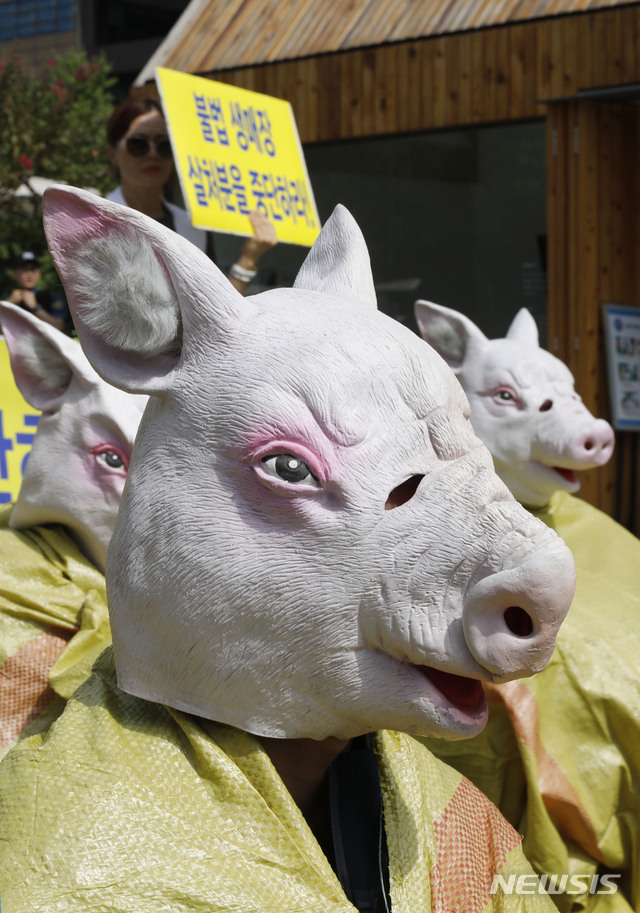 【서울=뉴시스】최동준 기자 = 동물권단체 케어, 한국동물보호연합이 26일 서울 광화문 광장에서 아프리카 돼지열병 생매장 살처분 중단 촉구 퍼포먼스를 하고 있다. 이들은 돼지 살처분 시 안락사를 해야 한다고 주장했다. 2019.09.26.