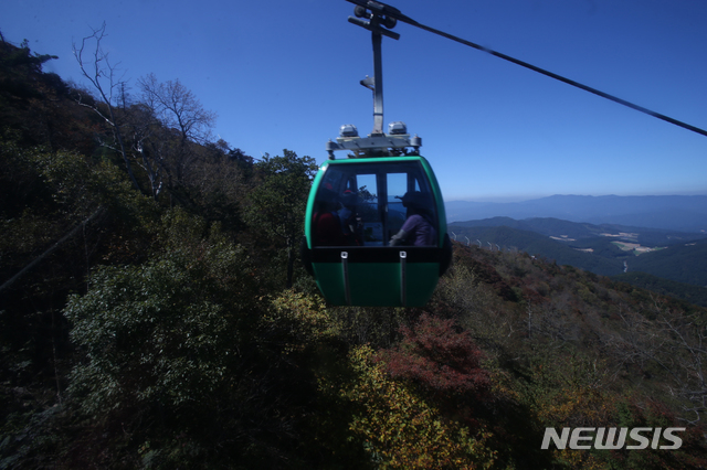【평창=뉴시스】 김경목 기자 = 화창한 가을 날씨를 보인 29일 오후 관광객들이 강원 평창군 발왕산(해발 1458m)에 오르는 케이블카에서 울긋불긋 물들기 시작한 가을 경치를 보고 있다.