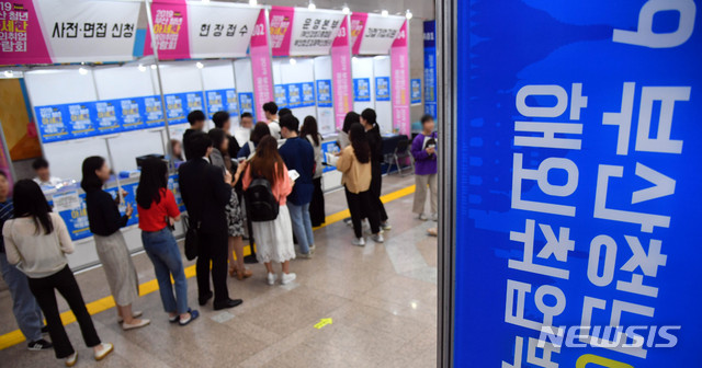 【부산=뉴시스】 하경민 기자 = 30일 오전 부산 연제구 부산시청 1층 로비에서 열린 '2019년 부산 청년 아세안 해외취업박람회'를 찾은 청년 구직자들이 면접신청을 접수하고 있다.