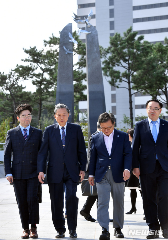 【부산=뉴시스】 하경민 기자 = 하토야마 유키오 전 일본 총리가 12일 오전 부산 남구 국립일제강제동원역사관을 방문, 추모탑을 참배한 이후 이동하고 있다. 2019.10.12.