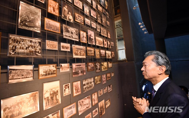 【부산=뉴시스】 하경민 기자 = 하토야마 유키오 전 일본 총리가 12일 오전 부산 남구 국립일제강제동원역사관을 방문, 전시관을 둘러보고 있다. 2019.10.12.
