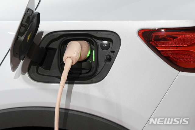 【로스앤젤레스=AP/뉴시스】볼보 자동차의 첫 전기차 'XC40'이 16일(현지시간) 미 캘리포니아주 로스앤젤레스에서 세계 최초로 공개, 충전하는 모습을 보여주고 있다.