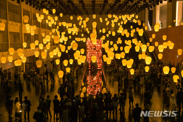 【서울=뉴시스】이영환 기자 = 한-아세안 열차 참가자들이 '한-아세안 열차' 둘째 날인 17일 광주 국립아시아문화전당에서 열린 특별전 '아세안의 빛, 하나의 공동체'에서 풍등을 바라보며 아시아의 평화를 기원하고 있다.