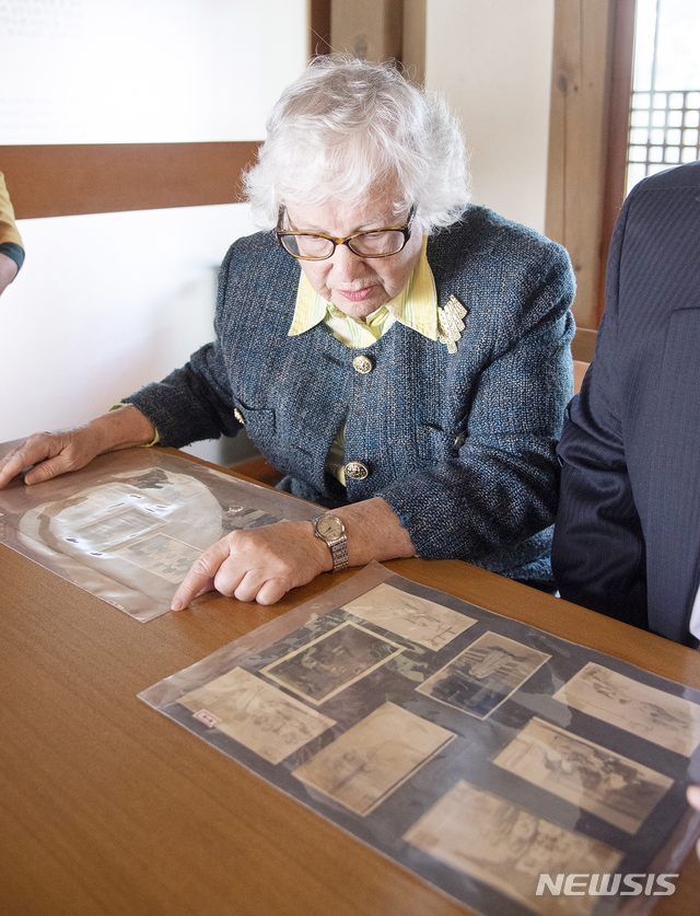 【서울=뉴시스】미국 내 3.1운동 정신 확산에 기여한 토비 앤 스타비스키(Toby Ann Stavisky, 민주당) 미국 뉴욕주 상원의원이 17일 서울 서대문구 이화여자대학교 역사관에서 유관순 열사 사진을 보고 있다. 2019.10.18. (사진=이화여자대학교 제공)
