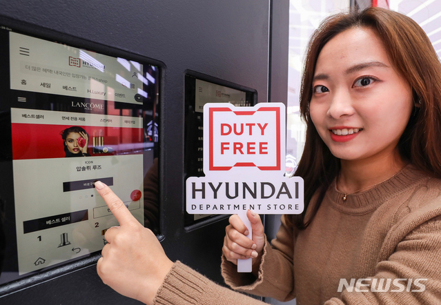 【서울=뉴시스】 한 팝업스토어 관계자가28일 서울 강남구 삼성동 코엑스 케이팝(K-POP) 광장의 '랑콤 팝업스토어'에서 키오스크를 통한 쇼핑을 소개하고 있다. 현대백화점 면세점은 다음달 3일까지 '랑콤'과 협업해 케이팝 광장에서 42m 길이의 대형 팝업스토어를 운영한다. 2019.10.28 (사진=현대백화점그룹 제공)