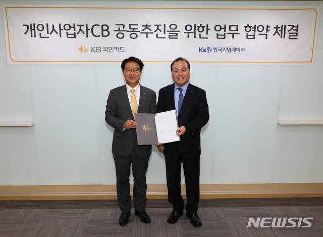 【서울=뉴시스】 고범준 기자 = 개인사업자 신용평가 사업 공동 추진을 위한 업무 협약식이 열린 지난 1일 서울 종로구 KB국민카드 본사에서 이동철(왼쪽) KB국민카드 사장과 송병선 한국기업데이터 대표가 기념촬영을 하고 있다. 2019.11.03. (사진=KB국민카드 제공)
