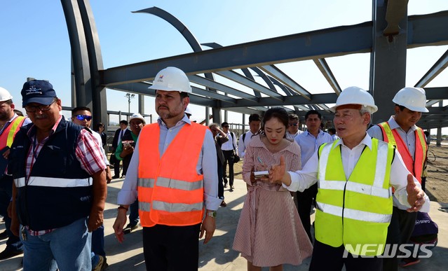 【만타(에콰도르)=뉴시스】공항사진기자단 = 손창완(오른쪽)한국공항공사 사장이 4일(현지시각) 에콰도르 만타국제공항 건설현장에서 호세 가브리엘 마르티네스 카스트로(왼쪽 두번째)교통건설부 장관을 비롯한 현장관계자들과 함께 현장을 둘러보고 있다. 2019.11.06.
