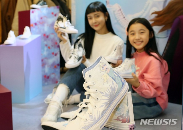 【서울=뉴시스】신세계백화점이 7일 오전 서울 서초구 신세계백화점 강남점에서 디즈니와 컨버스가 함께 제작한 겨울왕국 한정판 운동화를 선보였다. 사진은 모델들이 운동화를 들고 있는 모습. (사진=신세계백화점 제공) 2019.11.07.