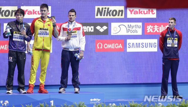 【몬트리올=AP/뉴시스】캐나다 몬트리올에 본부를 두고 있는 세계반도핑기구(WADA)가 13일(이하 현지시간) 약물 검사 회피 혐의를 받는 중국 수영 스타 쑨양에게 2~8년 자격정지를 요청한 것으로 알려졌다. 이 요청이 받아들여지면 쑨양은 내년 도쿄올림픽에 출전할 수 없다. WADA는 지난 3월 쑨양과 국제수영연맹(FINA)을 스포츠중재재판소(CAS)에 제소해 오는 15일 스위스 몽트뢰에서 공개로 심리가 진행된다. 사진은 쑨양(가운데)이 지난 7월 21일 광주에서 열린 세계수영선수권대회 남자 400m 자유형 시상대에 올랐을 때 동메달의 던컨 스콧(영국, 오른쪽)이 기념촬영을 거부해 따로 떨어져 서 있는 모습. 2019.11.14.