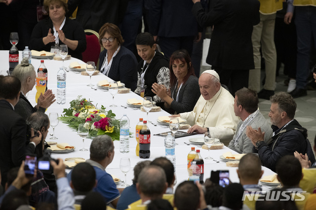 【바티칸시티=AP/뉴시스】프란치스코 교황이 17일(현지시간) 3번째 '세계 빈자의 날'을 맞아 바티칸에서 노숙자와 실직자 등 빈곤층과 함께 식사하고 있다. 교황은 소수 부자의 탐욕이 빈곤 문제를 악화시키고 지적했다. 2019.11.18
