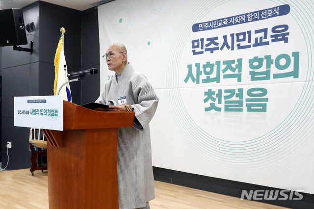 [서울=뉴시스]김병문 기자 = 지선 민주화운동기념사업회 이사장이 18일 오후 서울 종로구 서울글로벌센터 국제회의장에서 열린 '민주시민교육 사회적 합의 선포식'에 참석해 인사말을 하고 있다. 2019.11.18.