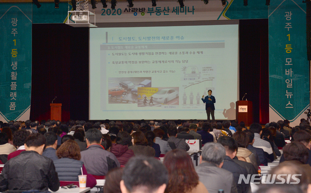 [광주=뉴시스]변재훈 기자 = 광주 지역 생활정보 포털 사랑방이 주최한 '2020 광주 부동산 세미나'가 19일 오후 광주 서구 김대중컨벤션센터에서 열리고 있다. 나강열 광주전남연구원 도시기반연구시장이 도시철도 2호선 착공에 따른 기대와 영향을 강연하고 있다. 2019.11.19.
