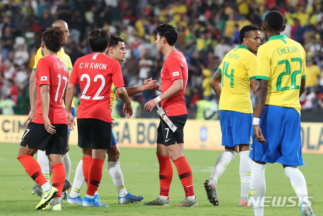 [아부다비(아랍에미리트)=뉴시스] 김진아 기자 = 19일(현지시각) 아랍에미리트 모하메드 빈 자예드 스타디움에서 열린 축구 국가대표 평가전 대한민국과 브라질의 경기, 0:3으로 패한 한국 손흥민이 브라질 선수들과 인사를 하고 있다. 2019.11.19.