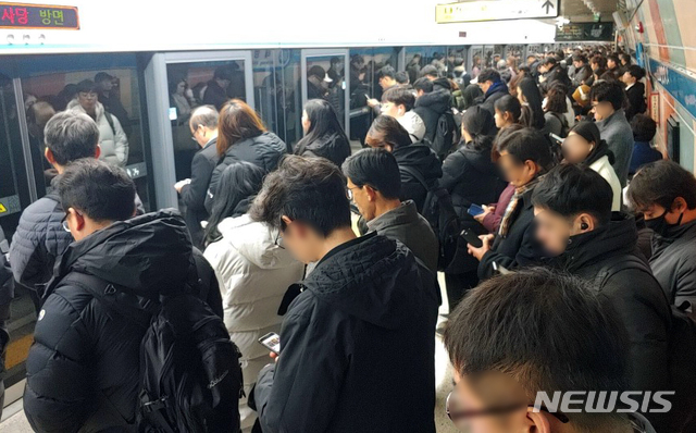 [서울=뉴시스]선바위역에서 남태령역으로 향하던 지하철 4호선 전동차에서 20일 오전 8시께 스파크와 함께 폭발음이 발생, 승객들이 전원 하차해 남태령역 승강장에서 대기하고 있다. (사진=독자 제공) 2019.11.20.