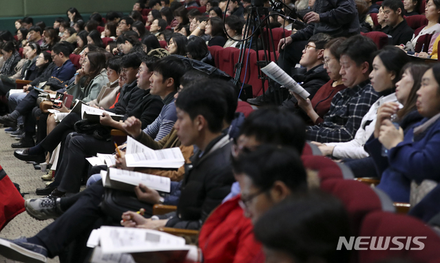 [서울=뉴시스]최진석 기자 = 서울시 고등학교 교사들이 21일 오후 서울 광진구 건국대학교에서 서울시교육청교육연구정보원 주최로 진행된 '2020 대입 정시전형 대비 교원 대상 진학지도 설명회'에 참석해 정시전형 관련 설명을 듣고 있다. 2019.11.21.