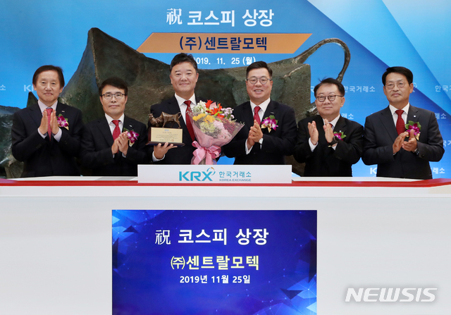 [서울=뉴시스]한국거래소 유가증권시장본부는 25일 오전 서울 여의도 한국거래소 서울사옥 신관로비에서 자동차 부품 제조업을 영위하는 센트랄모텍의 유가증권시장 신규상장기념식을 개최했다. 김병영(왼쪽부터) BNK투자증권 대표이사, 임재준 한국거래소 유가증권시장본부장, 이종철 센트랄모텍 대표이사, 정일문 한국투자증권 대표이사, 이원선 상장회사협의회 전무, 김원대 한국IR협의회 회장이 기념촬영을 하고 있다. (사진=한국거래소 제공) 2019.11.25.