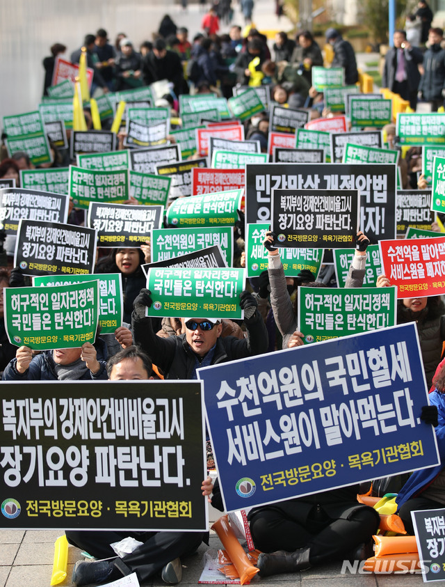 [서울=뉴시스] 김진아 기자 = 전국방문요양·목욕기관협회 관계자들이 25일 서울 중구 서울시청 앞에서 사회서비스원 폐지와 장기요양악법개정안 저지를 위한 민간장기요양기관 총궐기대회에서 구호를 외치고 있다. 2019.11.25.