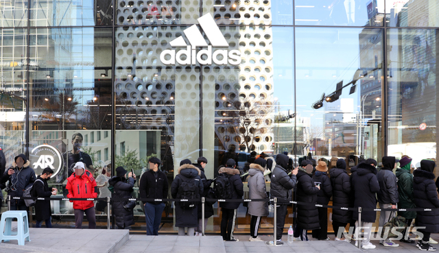 [서울=뉴시스]김근현 수습기자 = 시민들이 29일 오전 서울 강남구 아디다스 강남브랜드센터점에서 오늘 하루만 한정 판매하는 이지부스트 350 V2 블랙 운동화를 사기 위해 새벽부터 대기하고 있다. 2019.11.29.