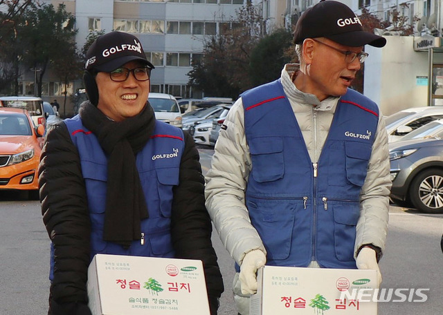 [서울=뉴시스]박미소 기자 = 박기원(왼쪽) 골프존 대표이사가 29일 서울 강남구 수서동 및 일원동 일대의 취약계층 가정의 아파트 단지에서 열린 '2019 사랑의 지역사회 봉사활동'에서 취약계층에 전달할 김치 박스를 옮기고 있다. (사진=골프존뉴딘그룹 제공) 2019.11.29.