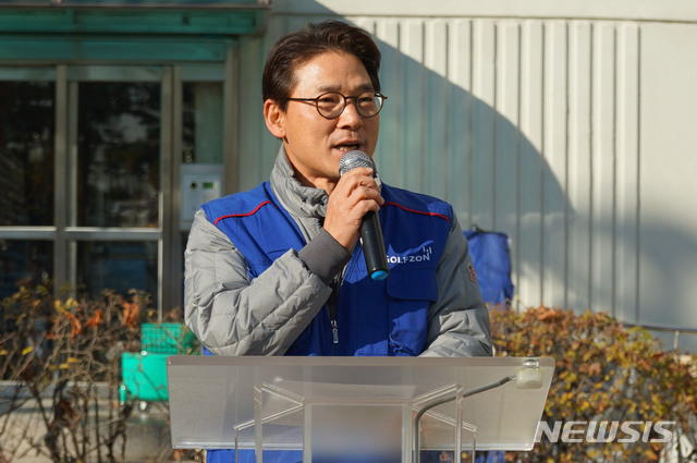 [서울=뉴시스]박미소 기자 = 최덕형 골프존뉴딘홀딩스 대표이사가 29일 서울 강남구 수서동 및 일원동 일대의 취약계층 가정의 아파트 단지에서 열린 '2019 사랑의 지역사회 봉사활동'에서 인사말을 하고 있다. (사진=골프존뉴딘그룹 제공) 2019.11.29.