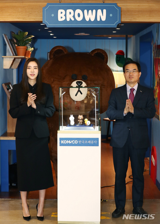 서울=뉴시스] 이영환 기자 = 조용만 한국조폐공사 사장과 가수 겸 탤런트 손담비, 라인프렌즈 캐릭터 브라운이 5일 오전 서울 용산구 라인프렌즈 이태원 플래그십스토어에서 열린 브라운앤프렌즈 기념매달을 공개행사에 참석해 메달을 공개하고 있다. 2019.12.05.