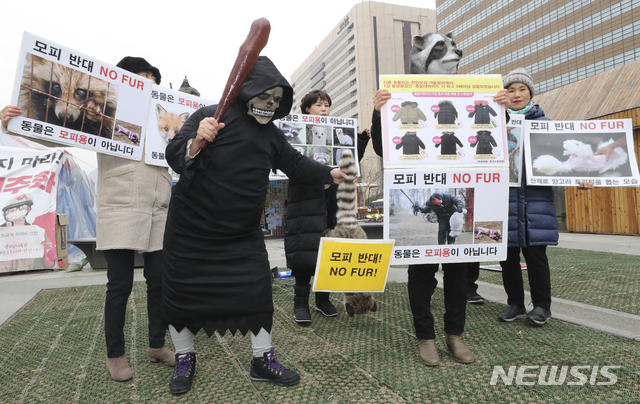 [서울=뉴시스]최진석 기자 = 한국동물보호연합 회원들이 9일 오후 서울 종로구 광화문 광장에서 '발암물질과 동물학대의 주범인 모피 반대 기자회견'을 하며 모피 반대 퍼포먼스를 하고 있다. 2019.12.09.