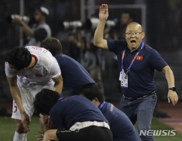 [마닐라=AP/뉴시스]베트남 축구 대표팀 박항서 감독이 10일(현지시간) 필리핀 마닐라의 리잘 메모리얼 스타디움에서 열린 2019 동남아시안(SEA) 게임 남자 축구 결승전 인도네시아와의 경기 중 작전 지시를 하고 있다. 베트남은 인도네시아를 3-0으로 꺾고 60년 만에 이 대회 정상에 올랐다. 2019.12.11.