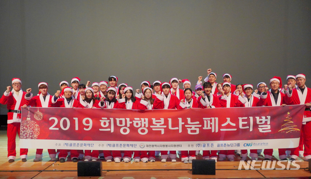 [서울=뉴시스]김영찬 골프존문화재단 이사장을 비롯한 참석자들이 연말을 맞아 21일 충남 대전시 충남대학교 정심화홀에서 ‘희망행복나눔페스티벌’ 기념 촬영하고 있다. (사진=골프존문화재단 제공) 2019.12.21.