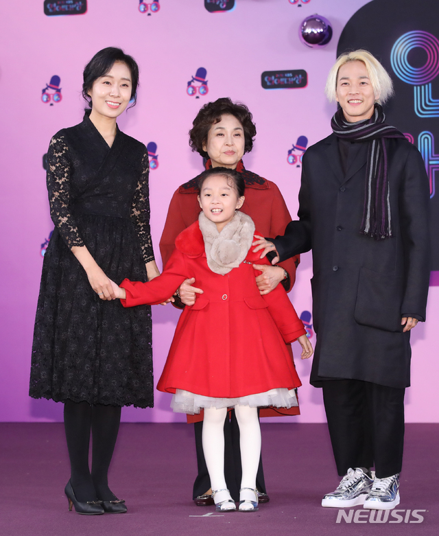 [서울=뉴시스]조수정 기자 = 2019 KBS 연예대상 시상식이 열린 21일 오후 서울 여의도 KBS에서 '살림하는 남자들2' 팝핀현준, 국악인 박애리, 딸 예술, 어머니 등 가족이 레드카펫으로 들어서며 포즈를 취하고 있다. 2019.12.21. [email protected]