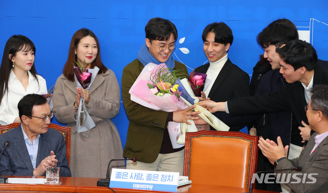 [서울=뉴시스] 장세영 기자 = 더불어민주당 '영입인재 2호'인 원종건 씨가 29일 서울 여의도 국회에서 열린 더불어민주당 인재영입 발표회에 참석해 친구들에게 꽃다발을 받으며 축하를 받고 있다. 2019.12.29.