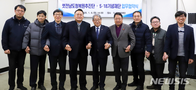 [광주=뉴시스] 신대희 기자 = 5·18기념재단과 문화체육관광부 옛 전남도청 복원 추진단 관계자들이 6일 광주 서구 5·18기념재단에서 성공적인 도청 복원을 위한 업무 협약을 맺었다. (사진 = 5·18기념재단 제공) 2019.01.06.