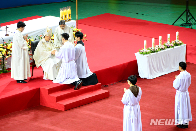[청주=뉴시스]인진연 기자 = 7일 충북 청주체육관에서 열린 2020년 천주교 청주교구 사제·부제 서품식에서 장봉훈 가브리엘 주교가 수품자에게 순명서약을 받고 있다. 2020.01.07