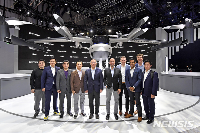 [서울=뉴시스]정의선 현대자동차그룹 수석부회장과 다라 코스로샤히 우버 CEO가 7일(현지시간) 미국 라스베이거스에서 열린 CES 2020 현대차 전시관 내 실물 크기의 현대 PAV(개인용 비행체) 콘셉트 'S-A1' 앞에서 'UAM(도심 항공 모빌리티) 사업 추진을 위한 협력 계약을 체결한 뒤 참석자들과 기념촬영을 하고 있다.