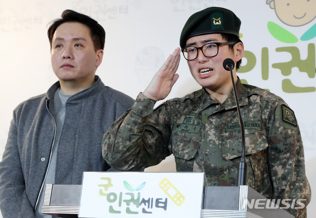 [서울=뉴시스]김근현 기자 = 휴가 중 해외에서 성전환 수술을 받고 돌아온 부사관 변희수 하사가 22일 오후 서울 마포구 군인권센터에서 육군의 전역 결정에 대한 긴급 기자회견을 하고 있다. 2020.01.22.