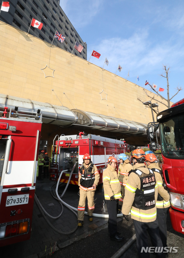 [서울=뉴시스] 전진환 기자 = 26일 오전 지하에서 원인을 알 수 없는 화재가 발생한 서울 중구 장충동 그랜드 앰배서더 호텔에서 소방관들이 상황정리를 하고 있다. 화재는 오전 4시 51분께 발생해 오전 10시경에 상황이 종료됐다. 화재 연기를 들이마신 투숙객과 호텔직원등 37명이 병원으로 옮겨졌다. 2020.01.26.