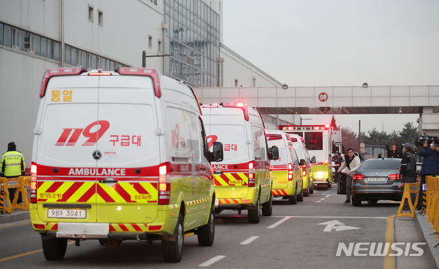 [서울=뉴시스] 고범준 기자 = 신종 코로나바이러스 감염증인 '우한 폐렴'으로 봉쇄된 중국 후베이성 우난에서 교민들이 입국하는 31일 오전 김포공항으로 119구급대 구급차들이 들어가고 있다. 2020.01.31.