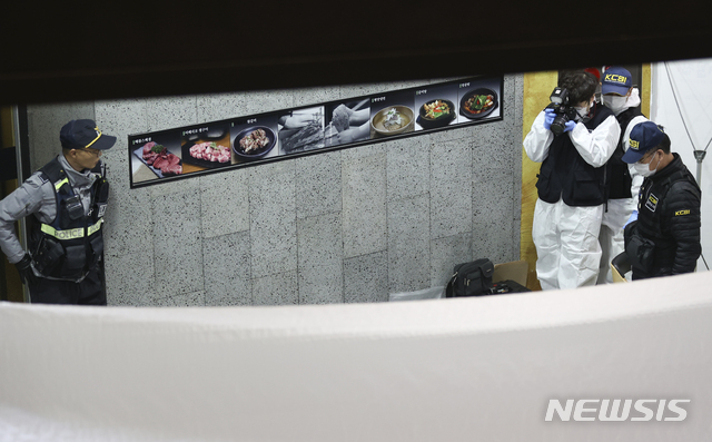 [서울=뉴시스]최진석 기자 = 12일 오전 서울 영등포구 여의도 증권가 식당에서 칼부림 사건이 발생해 경찰 과학수사대원들이 현장 조사를 하고 있다. 2020.02.12.