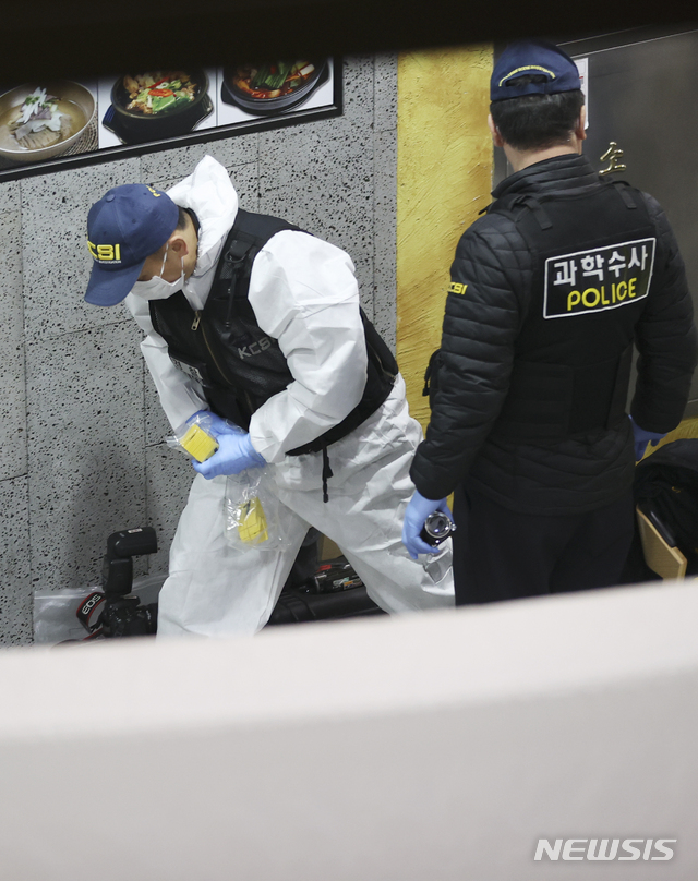 [서울=뉴시스]최진석 기자 = 12일 오전 서울 영등포구 여의도 증권가 식당에서 칼부림 사건이 발생해 경찰 과학수사대원들이 현장 조사를 하고 있다. 2020.02.12.