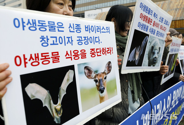 [서울=뉴시스] 최동준 기자 = 한국동물보호연합이 13일 서울 광화문 광장에서 기자회견을 열고 바이러스 원인인 야생동물 식용 중단을 촉구하고 있다. 2020.02.13.