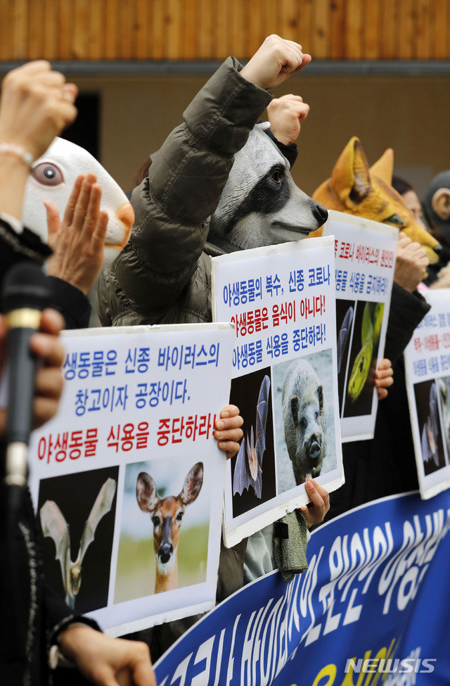 [서울=뉴시스] 최동준 기자 = 한국동물보호연합이 13일 서울 광화문 광장에서 기자회견을 열고 바이러스 원인인 야생동물 식용 중단을 촉구하고 있다. 2020.02.13.