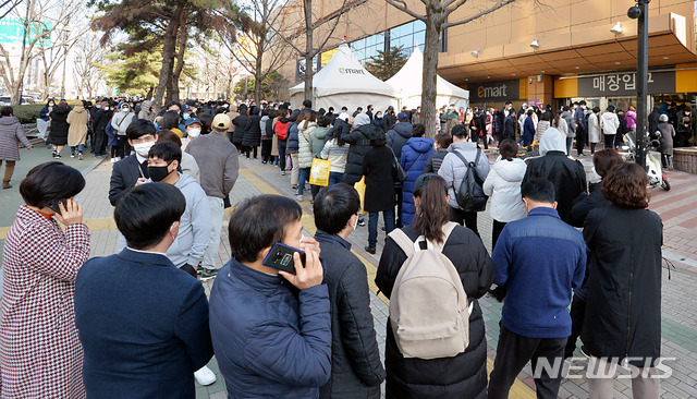 [대구=뉴시스] 이무열 기자 = 신종 코로나바이러스 감염증(코로나19) 확진자가 무더기로 급증하고 있는 24일 오전 대구 수성구 만촌동 이마트에서 시민들이 마스크를 구입하기 줄지어 차례를 기다리고 있다. 2020.02.24.