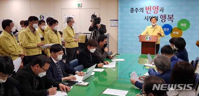 [충주=뉴시스]이병찬 기자 = 조길형 충북 충주시장이 25일 충주시청 브리핑룸에서 코로나19 확진자 발생에 관한 브리핑을 하고 있다.2020.02.25.