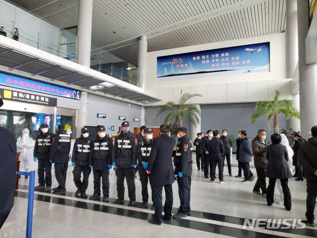 [서울=뉴시스] 박민석 기자=중국 산둥성 웨이하이국제공항에서 25일 방역요원들이 제주항공편으로 입국한 승객들을 버스에 태우고 있다. (사진=독자 제공) 2020.02.25.